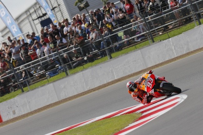 Claisificación Q2 MotoGP Gran Premio Gran Bretaña 2013 | Pos. | Num. | Piloto | País | Equipo | Moto | Km/h | Tiempo | Diferencia1st/Prev. | | 1 | 93 | Marc MARQUEZ | SPA | Repsol Honda Team | Honda | 323.5 | 2'00.691 | | | 2 | 99 | Jorge LORENZO | SPA | Yamaha Factory Racing | Yamaha | 322.0 | 2'00.819 | 0.128 / 0.128 | | 3 | 35 | Cal CRUTCHLOW | GBR | Monster Yamaha Tech 3 | Yamaha | 319.7 | 2'01.425 | 0.734 / 0.606 | | 4 | 6 | Stefan BRADL | GER | LCR Honda MotoGP | Honda | 326.3 | 2'01.558 | 0.867 / 0.133 | | 5 | 26 | Dani PEDROSA | SPA | Repsol Honda Team | Honda | 323.1 | 2'01.624 | 0.933 / 0.066 | | 6 | 46 | Valentino ROSSI | ITA | Yamaha Factory Racing | Yamaha | 322.3 | 2'02.109 | 1.418 / 0.485 | | 7 | 4 | Andrea DOVIZIOSO | ITA | Ducati Team | Ducati | 321.3 | 2'02.123 | 1.432 / 0.014 | | 8 | 19 | Alvaro BAUTISTA | SPA | GO&FUN Honda Gresini | Honda | 325.2 | 2'02.252 | 1.561 / 0.129 | | 9 | 69 | Nicky HAYDEN | USA | Ducati Team | Ducati | 321.3 | 2'02.289 | 1.598 / 0.037 | | 10 | 38 | Bradley SMITH | GBR | Monster Yamaha Tech 3 | Yamaha | 320.0 | 2'02.409 | 1.718 / 0.120 | | 11 | 5 | Colin EDWARDS | USA | NGM Mobile Forward Racing | FTR Kawasaki | 308.2 | 2'04.032 | 3.341 / 1.623 | | | 41 | Aleix ESPARGARO | SPA | Power Electronics Aspar | ART | | | |