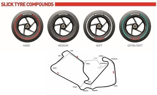 Diez curvas a derecha y ocho a izquierdas obligan a usar compuestos asimétricos en el tren trasero con goma más dura en el lateral derecho. Dado que Silverstone cuenta con una velocidad media bastante elevada, los neumáticos tienen que combinar facilidad para coger temperatura pero además grandes dosis de agarre.