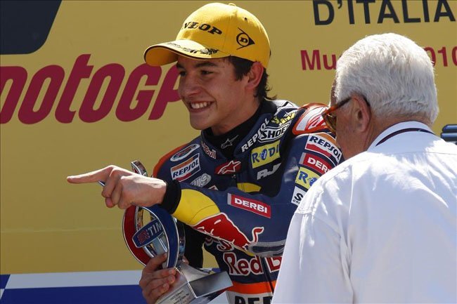 ¿Dónde hay que firmar para que todas las carreras sean de este tipo? Y es que 125, una vez más, nos ha ofrecido una carrera muy divertida en la que no ha habido tiempo casi para respirar. Pero no sólo eso, sino que encima hemos vuelto a hacer un nuevo triplete, y van cuatro (las carreras que llevamos). Además el primero ha sido un excelente Marc Márquez, que ha conseguido así su primera victoria en el Campeonato del Mundo, ¡y vaya cómo y dónde la ha conseguido! Porque ha hecho un carrerón y estamos en el GP de Italia, en el precioso circuito de Mugello.