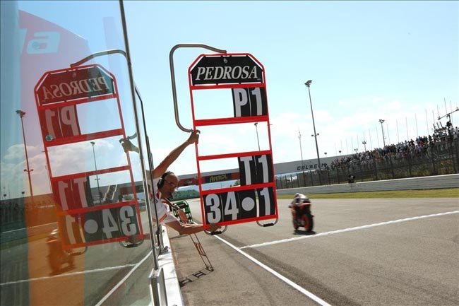 Aunque parecía que Jorge Lorenzo iba a volver a hacerse con la Pole tras haber superado esta mañana a Dani Pedrosa en los segundos libres, al final ha sido el piloto de HRC el que se ha llevado el gato al agua y ha aventajado al líder del Mundial en 308 milésimas. Parece que Jorge Lorenzo no ha encontrado hoy los "settings" de la Yamaha y ha estado toda la sesión cronometrada en los puestos de atrás, para auparse hasta la segunda posición en los últimos momentos de la cronometrada oficial.