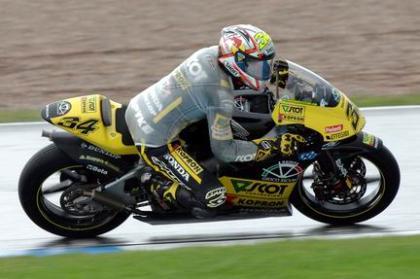 La carrera ha sido, con diferencia, la que se ha disputado en perores condiciones de todas las categorías, ya que en los inicios caía un auténtico diluvio sobre Donington Park. Y el resultado de estas condiciones: sólo lograron finalizar la prueba 17 pilotos de los 26 que tomaron la salida. Una auténtica lotería. Y desde luego, los españoles no llevaban esta vez ninguno de los premios gordos. De hecho, se podría decir que ni la pedrea. Barberá se fue al suelo hasta tres veces (una de ellas en la vuelta de calentamiento). Bautista, en un cómodo cuarto puesto, se iba también al suelo en Coppice, curva que también recibiría a Jorge Lorenzo unas vueltas más tarde, cuando rodaba tercero. El siguiente fue Julián Simón, que estaba luchando por el podium con Hiroshi Aoyama (que acabó finalmente 3º) cuando se fue al suelo. Por suerte, Simón pudo volver a pista y finalizó en una meritoria 7ª plaza.