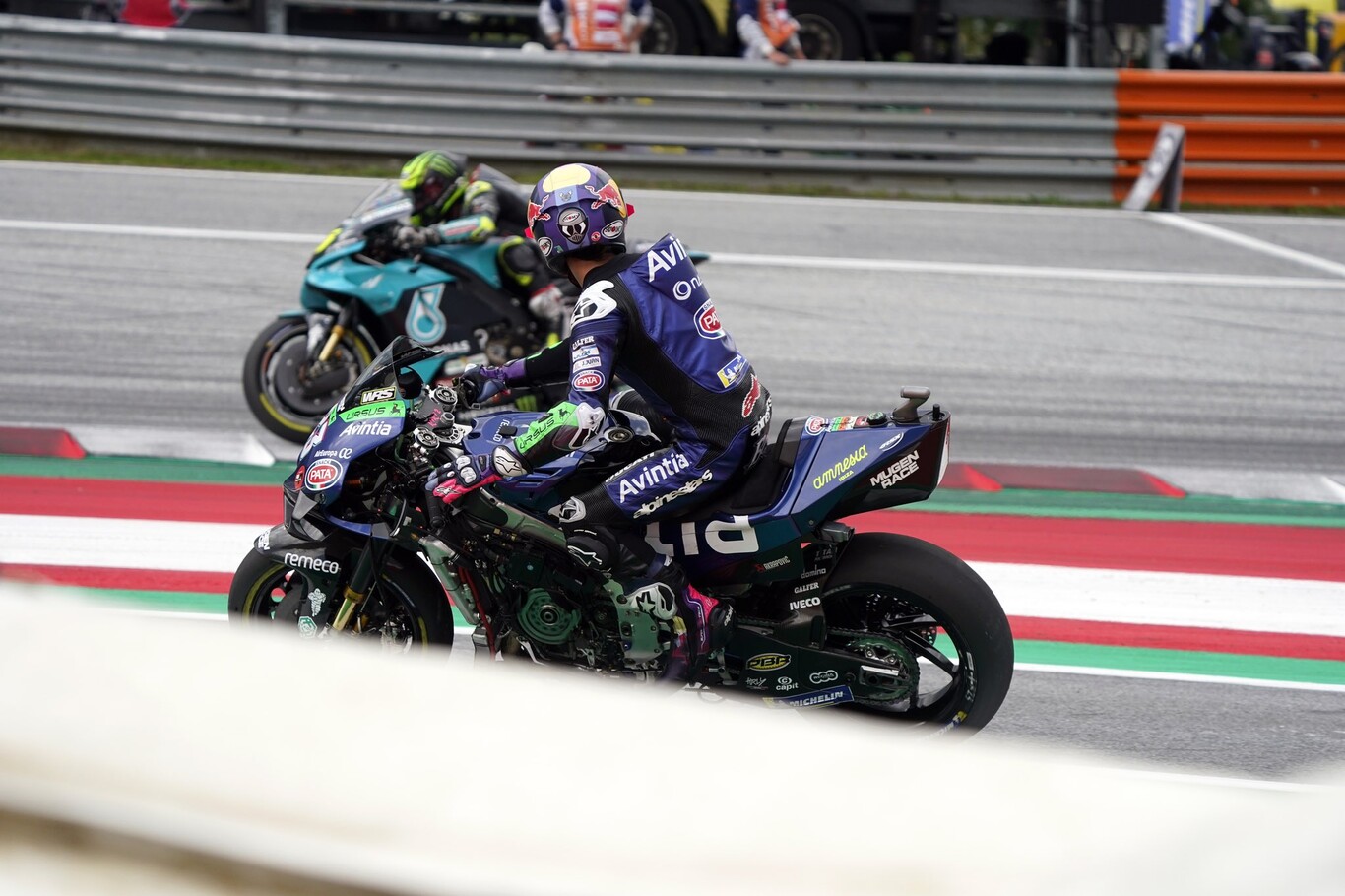 El incidente ocurrió en las primeras vueltas de la carrera, cuando Bastianini rodaba en la décima posición. Primero vimos a un comisarios recogiendo de mitad de la pista una pieza inusualmente grande, impropia de un toque entre pilotos de los que suelen acontecer en los primeros giros. Luego descubrimos el porqué.