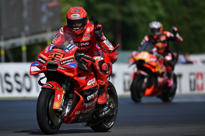 Gran Premio de Australia de 2024. Marc Márquez se quita una lámina de su casco justo antes de la salida y la tira al aire, con tan mala suerte de que cae justo debajo de su rueda trasera. El resultado fue que cuando se apagaron los semáforos Márquez tuvo que hacer malabares para no caerse de la Ducati. ¿Qué habría pasado si Márquez se cae saliendo en primera fila?