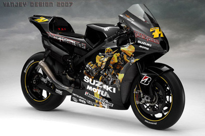 En Vanjey-design han aparecido estas imágenes sobre las motos del equipo Rizla Suzuki del mundial de MotoGP, en las que desaparece Rizla como patrocinador e incorporan publicidad del último bombazo de la taquilla mundial, la película de los Transformers. No parece que Rizla vaya a abandonar el mundial, sino mas bien un ejercicio de diseño, pero no estaría nada mal ver las motos de Hopkins y de Vermeulen con estos colores en la próxima cita mundialista en Sachsenring.