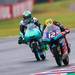 Durante el resto de la carrera Marco Bezzecchi siguió tirando hasta sacar oro de sus neumáticos de agua sobre una pista con un carril claramente seco en la mayor parte de la pista. Entre tanto, en el segundo grupo Fabio DiGiannantonio mantenía con firmeza la segunda posición hasta que a falta de ocho vueltas un crecidísimo Jaume Masia pasó con extrema facilidad a Norrodin, Canet y DiGiannantonio.