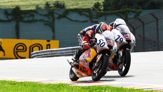Sin embargo, en una época dominada por este tipo de configuración, aun es posible escuchar el hermoso zumbido de un motor de 125cc al pasar de 8000 vueltas. Las motos austríacas que en otro tiempo se utilizaron en la categoría de 125 por gente como Marc Márquez – ¡qué tiempos! – son ahora aprovechadas para esta copa de promoción en la que los aspirantes pueden ir aprendiendo los circuitos del calendario de MotoGP.