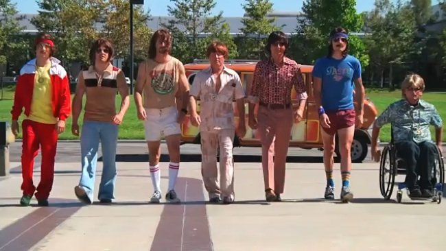 Pero lo que es la puesta en escena es delirante: todas las estrellas de Yamaha de todos los tiempos, incluso Wayne Rainey en su silla de ruedas (algo que destaco solo porque se me sigue haciendo duro verlo así, no porque él no se preste a estas cosas) entran en la camioneta más hippy del paddock y el grupo viaja a los setenta, dejando atrás al pobre Fabio. Jorge Lorenzo, Ben Spies, Cal Crutchlow y Colin Edwards junto a Kenny Roberts Sr, Wayne Rainey y Eddie Lawson. ¿Preparados?