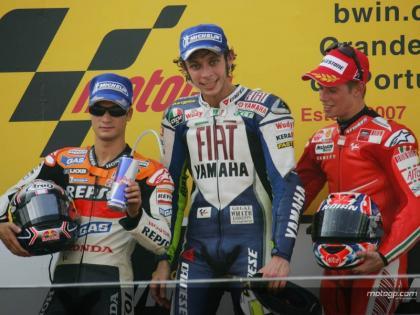 Y es que las carreras son tan diferentes cuando todos están en igualdad de condiciones... Un circuito en el que los Michelin han estado a la altura en carrera, y el resultado está a la vista de todos: una interesante carrera con los mejores pilotos luchando delante. Lástima del pequeño problema que asegura haber tenido Casey Stoner en la primera fase de la carrera, porque de no haber sido por ese contratiempo hubiéramos visto una lucha a tres de esas que no veíamos desde el GP de Catalunya. Al final, Rossi ha conseguido su cuarta victoria del año. Y no ganaba desde Assen. Pero vaya carrerón se ha marcado para volver a subirse a lo más alto del podium. Pedrosa finlizó 2º y Stoner 3º. Así pues, el australiano tendrá que esperar para proclamarse campeón del mundo.