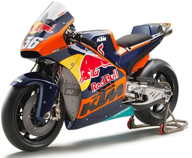 Ataviada con el naranja corporativo de la marca sobre un fondo azul oscuro, la RC16 recibe en su carenado el patrocinio de, como no podía ser de otro modo, Red Bull. La marca de bebidas energéticas y los lubricantes Motorex tan ligados a la firma naranja serán los únicos (junto a WP) que destaquen en las fibras de la moto austríaca.