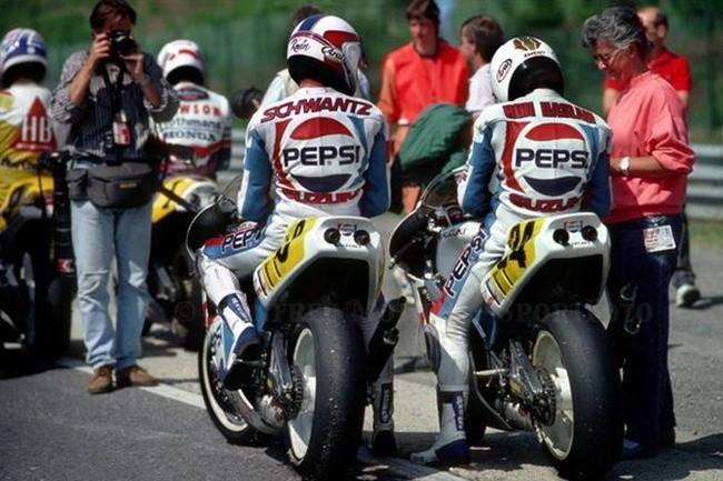 Se trata en concreto del GP de Bélgica de 1989 en el Circuito de Spa Francorchamps, segunda temporada de Pepsi como patrocinador del equipo Suzuki con Kevin pajarito Schwantz y Ron Rocket Haslam. Y lo más curioso de esta foto es que cada piloto está subido en la moto de su compañero: Schwantz con la 8 de Haslam y éste con la 34 del texano.