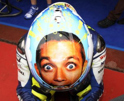 Cada año, y ya como si se tratase de una tradición, Rossi estrena una decoración especial para su casco. En años anteriores habíamos visto el casco del de Tavulia pintado con las figuras de Enzo Ferrari, una chica desnuda o a Steve McQueen entre otros. Este año el protagonista de su casco es el mismo, ya que Rossi ha pedido que pinten su cara en la parte de arriba del casco. En el gesto de su cara, los ojos y la cara muy abiertos se ven por encima de la cúpula cuando Rossi va metido en ella, dando el aspecto de que está "flipando" con la velocidad de su Yamaha M1.