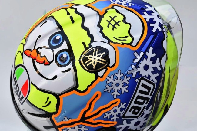 Decorando la calota de su casco gracias a las manos de Aldo Drudi, hemos podido ver además de los típicos copos, un gran muñeco de nieve descentrado sobre toda la zona superior. Ataviado con un gorro y una bufanda, este sonriente muñeco era el encargado de acompañar a Valentino en las jornadas de test.