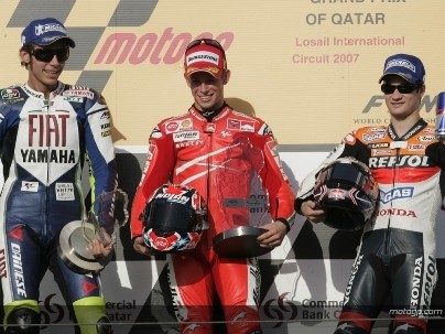 La primera victoria en MotoGP, del piloto que junto a Dani Pedrosa está llamado a dominar en la categoría en un futuro cada vez más presente, ha sido sencillamente impecable. Casey Stoner ha conseguido la victoria en la primera cita de la temporada, el GP de Qatar, y lo ha hecho de manera inapelable, saliendo victorioso de un duelo ante el mismísimo Valentino Rossi.