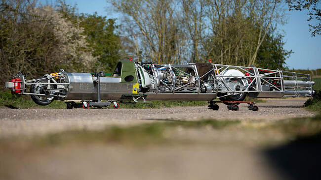 Pues así como os lo presentamos es como van a intentar cazar este récord nada fácil, el equipo ha construido una estructura de acero y aluminio que mide algo más de nueve metros de largo y que en su interior lleva calzado un motor de turbina Rolls-Royce de 1.200 caballos procedente de un helicóptero militar británico.
