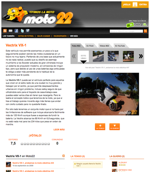 En la página de cada modelo encontraremos información completa de prácticamente todos los productos publicado en Moto22. No sólo nuestros posts, sino también las fotos que hay en Flickr sobre ellos y los vídeos de Youtube en los que aparecen.