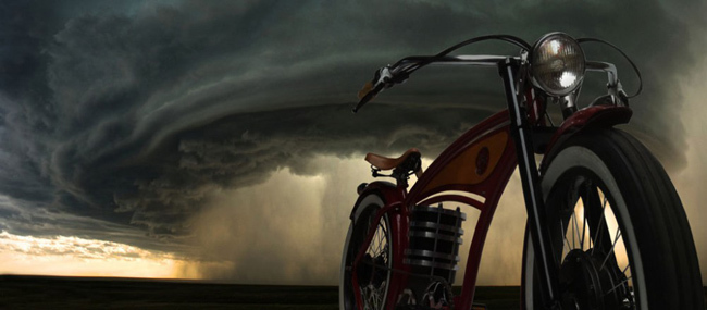 En el vídeo promocional vemos al inventor/diseñador de esta curiosa bicicleta eléctrica paseando sobre su invento. La estética está basada en las Harley Davidson de 1912, y como pretenden ofrecer que la bicicleta utilice uno o dos paquetes de baterías encontramos que el motor simulado cuenta con uno o dos cilindros en los que imagino que irán escondidas esas baterías.