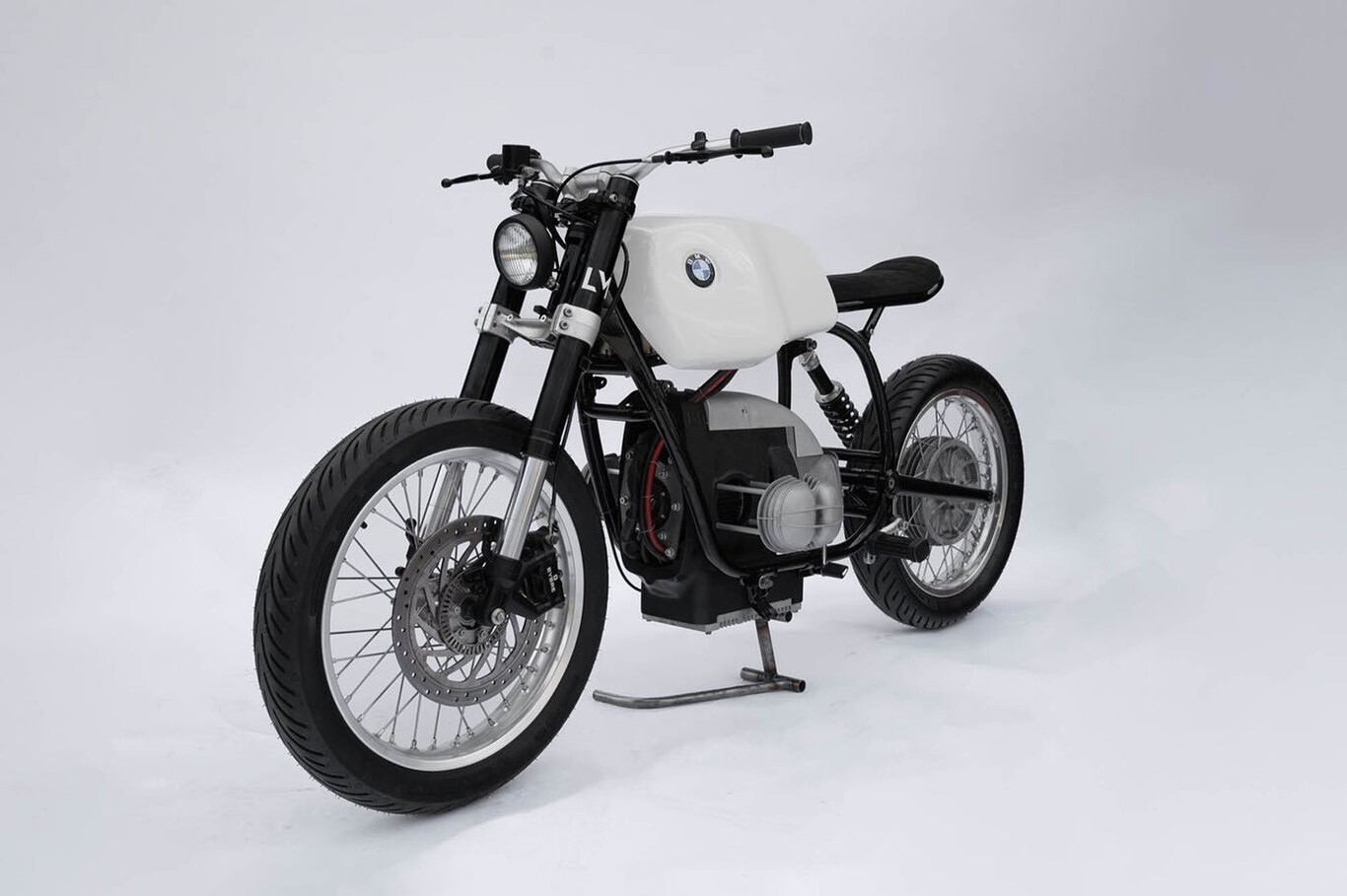 El resultado, es esta BMW R00 que estáis viendo en imágenes. El diseño original partía de una BMW R80 a la que vaciaron de lo imprescindible. El subchasis como podéis apreciar, se redujo a la mínima expresión y se varió la doble suspensión para dejarla en una única monoamortiguador. El resto del vehículo sigue igual, utilizando el mismo chasis y actualizando el resto de componentes con tecnología moderna.