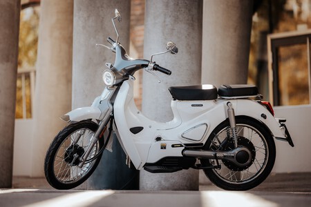 No obstante, lo que más llama la atención de este modelo es su exterior. Y es que cuenta con un diseño clásico que nos recuera mucho a la Honda Super Cub de los años 80/90. De hecho, tan parecida es que utiliza soluciones practicas vistas en la japonesa como un asiento dividido en dos, un panel para proteger las piernas o unas ruedas altas de radios.