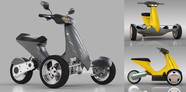 La idea podríamos decir que es muy parecida al Piaggio MP3, pero con un mayor ancho de vía que permite inclinar más que el triciclo de Piaggio, con lo que parece que da muchas más opciones a la hora de "hacer el burro" ya sea sobre hielo, tierra o arena. Fijándonos con detenimiento en el vídeo me parece que alguno de los prototipos que vemos va propulsado por un motor de explosión. Motor que tiene toda la pinta de haber salido de un scooter de pequeña cilindrada. Pero de manera muy hábil, en esas imágenes no oímos el sonido ambiente. A cambio las últimas versiones ya parecen ir propulsadas por un motor eléctrico insertado dentro de la rueda trasera.