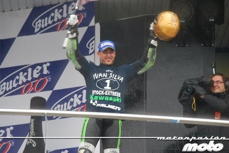 Faltaban una pocas vueltas para que acabará la carrera de Stock Extreme cuando en la primera curva del circuito ya iban preparándose los amigos y miembros del equipo de Iván Silva. Así, nada más pasar bajo la bandera a cuadros se paró y se plantó la camiseta para la ocasión y cambió su casco por uno dorado con un gran número uno en el centro. Ya en el podio, alguno de su propio equipo se quedó con ganas de bañarse en cava, ya que con las prisas, el amigo Iván no abrió la botella (al menos allí).