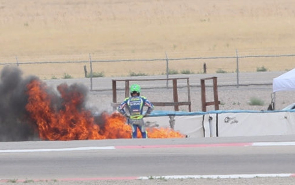 Yoshimura Suzuki's @tonielias24 crashed his GSX-R1000 yesterday and the bike, air fence and Styrofoam blocks caught fire. After watching things burn, Elias hitchhiked back with @Scholtzm20, who almost ran off the track with Elias and got a friendly head slap for his efforts. pic.twitter.com/sCLrJcxhLT