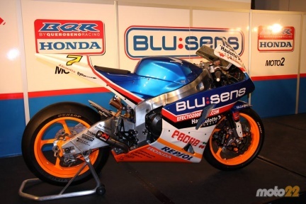 Mientras tanto la imagen más esperada se encontraba tapada bajo una sábana azul, la nueva moto. Llegó por fin el momento y Carmelo Ezpeleta, Juan Moreta, Jose Ramón García de Blusens, Raul Romero como propietario del equipo BQR y Dani Rivas, descubrieron la que será la moto del futuro en el campeonato del mundo de motociclismo sustituyendo a 250 c.c.