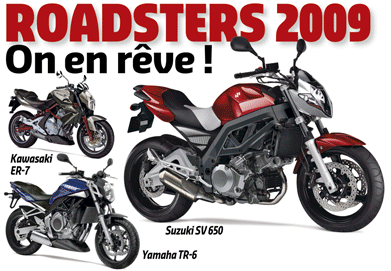 Gracias a Marcos podemos presentaros estas imágenes de lo que parece que serán los planes de tres de las fábricas japonesas para 2009. Suzuki presenta un restyling de la SV 650, mientras que Kawasaki presenta una ER-7, y Yamaha aparece con una nueva TR-6. De momento no hay más datos, solo la especulación de que todos estos modelos serán las novedades para 2009.