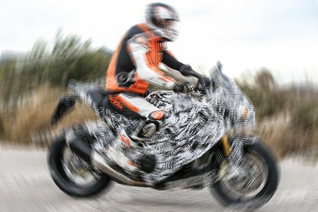 Un par de tapas laterales, colores de camuflaje en blanco y negro, faros disimulados, retrovisores cogidos de la Super Duke, una pantalla un poco más alta y casi da el pego. Pero la tapa del embrague, la quilla, el radiador y, sobre todo el escape y la tapa lateral que se ve debajo del camuflaje no dejan lugar a las dudas.