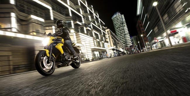 Efectivamente, en el motor mejor no cambiar nada, porque si ya funciona más que bien el bicilíndrico de 649 cc de 8 válvulas DOHC con sus 72 CV a 8500 rpm para que vamos a meternos en caballerías. Los detalles que se han cambiado son el filtro del aire, que ahora es de papel en vez de la espuma con aceite de la versión anterior. Se ha mejorado las tomas de aire de la caja de admisión sacándolas a través de los tubos del chasis. Y el silencioso se ha remodelado ligeramente dándole una imagen un poco más angulosa. Ahora también se le ha dado más presencia a los tubos de escape en la zona delantera del motor, ahora aparecen de un color metálico que contrasta con el color negro del motor.