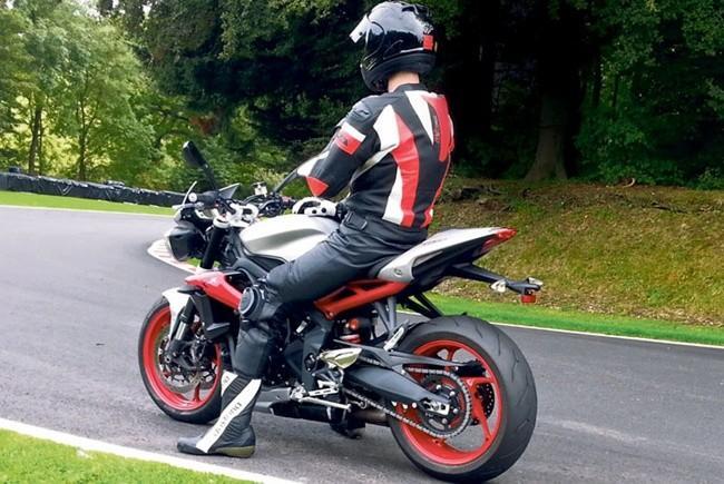 Según podemos observar en esta foto tomada en el circuito de Cadwell Park la semana pasada, la parte posterior de esta nueva Triumph Street Triple RX toma el colín de la Triumph Daytona 675, haciendo que la parte trasera toma unas formas mucho más deportivas. Eso sí, a pesar de dar la impresión de que es monoplaza, la presencia de las estriberas traseras delata que la tapa del colín se puede sustituir por un asiento para el pasajero.