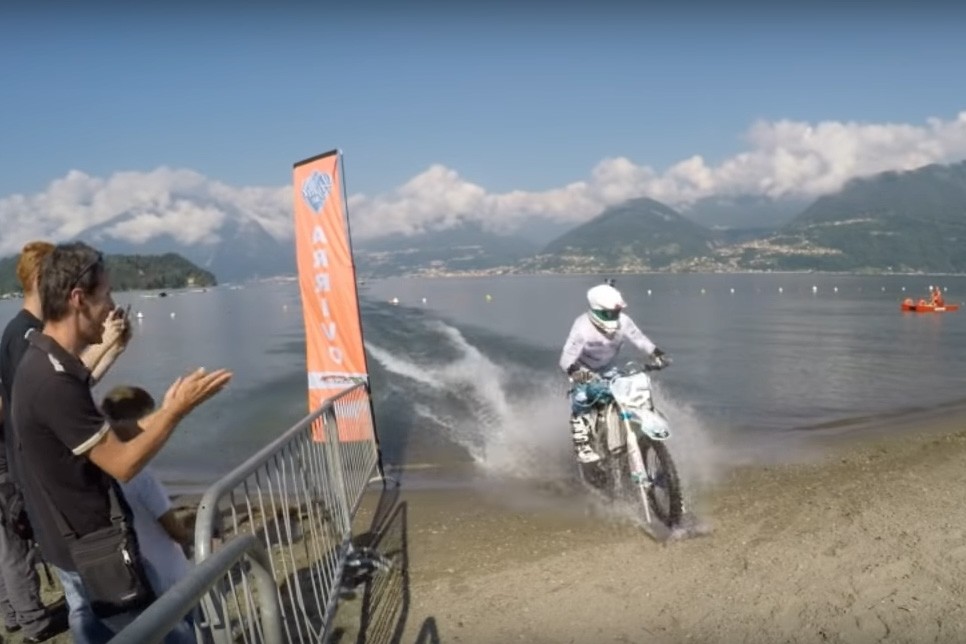 El 30 de julio de 2017 el piloto Luca Colombo consiguió la gran hazaña (casi milagro como lo calificamos en su momento) de cruzar el Lago de Como a lomos de su moto. ¡Y no era de agua! Era una moto de cross con ciertas modificaciones para que pudiese flotar.