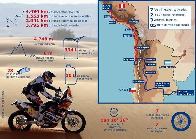Cuando la caravana del Dakar 2012 llegó a la mitad del recorrido y con él, al día de descanso, el equipo MRW en el que militan los pilotos españoles Marc Coma y Joan Pedrero, publicaron los datos de la cantidad de material que habían utilizado en sus KTM oficiales para hacer frente a los 4.494 kilómetros recorridos de los que 1.553 habían sido en especiales cronometradas.