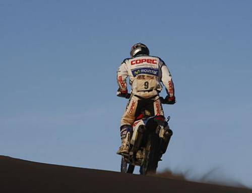 Yo solito me he complicado la vida en la etapa de hoy. AL principio me he sentido tranquilo sobre la moto, firme, fuerte y no demasiado cansado. Se me han metido dos piedras en las llantas, una en la trasera y otra en la delantera, y ni me he dado cuenta. En el kilómetro 245 he visto el estado en el que se encontraban mis llantas. Totalmente reventadas. Entonces he tenido la suerte de que llegara Rubén (Faria), el 2º piloto del equipo Red Bull. Nos hemos intercambiado la llanta delantera. He pensado que no era necesario cambiar la trasera. Al reanudar la carrera he rodado con cuidado para preservar la rueda trasera. Estoy feliz de haber terminado la carrera... He tardado 15’ en repostar. Rubén, por suerte, ha llegado 2 ó 3 minutos después de mí. Ha podido conducir bien, sin excesivos problemas en las llantas. Ha sido una jornada verdaderamente increíble.