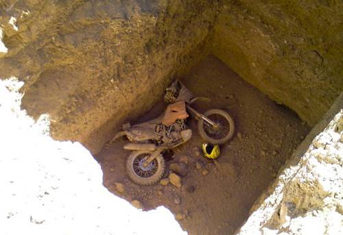 Como podéis ver en la foto, el agujero da verdadero pánico, pues son unos seis metros de profundidad. Lo sorprendente vino después ya que uno de los helicópteros descendió y ayudaron a Annie a bajar hasta la moto mediante una cuerda. Después de comprobar que se encontraba en buenas condiciones, solicitó que le echasen una mano para sacar la moto de ahí, pero le dijeron que tenía que esperar al camión de asistencia para que lo hiciesen ellos.