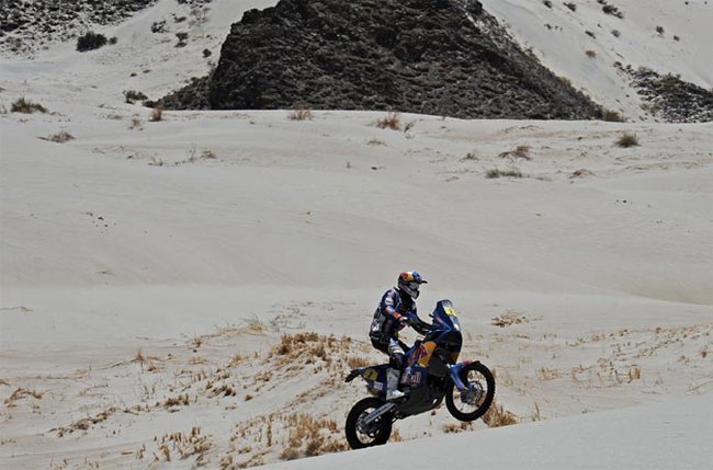 Me encantan estas cosas. Ayer Cyril Despres hablaba con una sonrisa irónica en la cara sobre los “chuparuedas” del Dakar en clara referencia a Marc Coma que le había alcanzado en ruta. Pues hoy el piloto catalán ha contestado de la mejor manera que sabe; en la pista. Y es que gracias a sus dotes para la navegación y a los errores que ha cometido el de Yamaha el francés le ha colado diez minutos. La victoria ha sido, como no podía ser de otra manera, para Marc con Cyril y su mochilero, Rubén Faria, justo por detrás de la KTM.