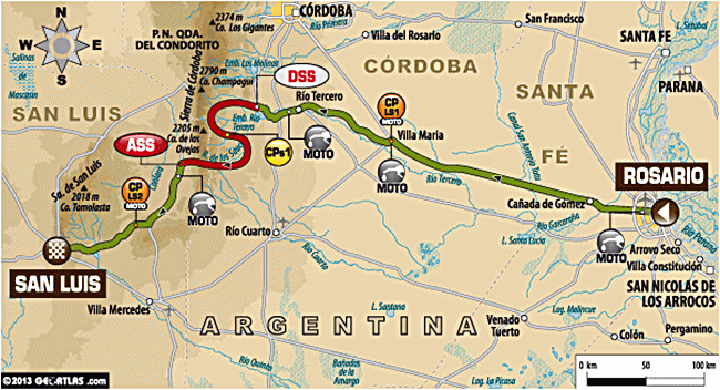 Los motoristas arrancarán muy temprano, a las 04:20 de la mañana hora Argentina saldrá el primer corredor para completar el primer enlace y estar listo para el pistoletazo de la especial cronometrada, que comenzará a las 10:20 (para que podáis calcularlo, tenemos cuatro horas de diferencia con lo que aquí la salida será a las 14:20). Será desde la ciudad de Rosario en la región de Córdoba Santa Fé para llegar al final de día a San Luis.