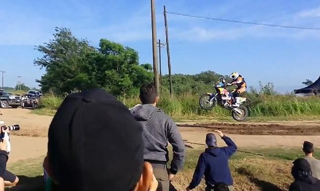 Porque tenéis que pensar que no estamos hablando de un circuito. Popr aquí, ni Sam Sunderland ni ninguno piloto han pasado antes por ese punto por lo que se tiene que fiar ciegamente de su experiencia, la lectura que sus ojos hagan de la carretera, la capacidad de analizar la situación y el terreno, lo que le marca el road-book que ve con el rabillo del ojo... y todo ello mientras circula gas a fondo.