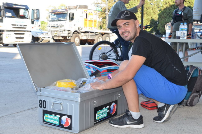 Empezamos con uno de los verdaderos aventureros, los denominados malles-motos (motos sin asistencia). Manuel Lucchese era de los primeros en tener acceso al cajón que la organización lleva de una etapa a otra. Y sin embargo fue de los últimos en pasar las verificaciones. Os preguntaréis el motivo, y lo contaba el propio italiano: