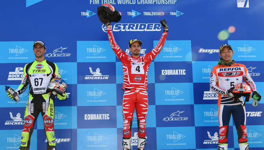 A sus 20 años Jaime Busto a conseguido su primera victoria en el TrialGP. Una carrera ganada además con mucho trabajo, esfuerzo y un total de 19 puntos de penalización que fueron suficientes para vencer a un Toni Bou, ya con mejores sensaciones que el sábado, y que firmó 22 puntos.