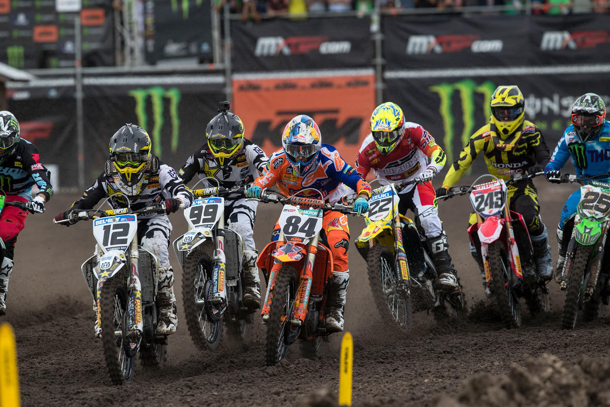 En la segunda salida volvió a ser Covington el más rápido, aunque su séptima holeshot de la temporada no le sirvió más que los pocos segundos que RJ Hampshire tardó en adelantarle y poner tierra de por medio. Intentando seguirle, Covington, Seewer y Kjer Olsen tiraban fuerte, hasta que al llegar a una profunda rodera el joven piloto de Dinamarca se iba al suelo perdiendo todas las opciones de podio.