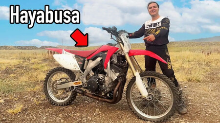 Una Suzuki Hayabusa 1340 con unos 200 CV metida a martillazos en el chasis de una Honda CRF450. Soldaduras, radiadores imposibles, un depósito hecho a mano y cero margen para el error. Parece un chiste. Pero arranca, entra en tierra y, contra todo pronóstico, se mueve como una auténtica dirt bike.