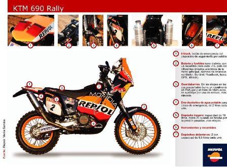 Interesantísima infografía que nos acerca el departamento de prensa de Repsol para presentarnos al detalle la moto con la Marc Coma intentará, en primera instancia, acabar la siempre complicada aventura del Dakar, y una vez conseguido esto, hacerlo lo más arriba posible en la clasificación. De entrada, llevar una KTM 690 Rally le debe permitir luchar por ganar esta edición del Dakar, y si no echardle un vistazo a todos los secretos que esconde la moto que ha venido marcando el paso en las últimas ediciones del raid más peligroso del mundo.