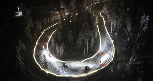 La idea es tan simple como efectiva. Delimitar el trazado con tiras LED visibles desde lejos, marcando curvas, rectas y zonas clave del circuito, y permitir que motos y coches sigan rodando cuando el sol desaparece del horizonte. El resultado es una pista sobre nieve que, de noche, parece sacada de un decorado de fantasía: líneas de luz flotando sobre un paisaje completamente blanco, con el ruido de los motores rompiendo el silencio del Ártico.