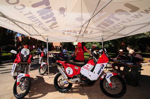 La prueba de ayer, una toma de contacto con el terreno de 300 kilómetros en Ait Ouzik con dos bucles cronometrados de 277 kilómetros en total. Arranca con cincuenta kilómetros técnicos para luego atravesar un paso elevado entre dos montañas y finalizar recorriendo una planicie. A continuación y después de repostaje, repiten el mismo recorrido.