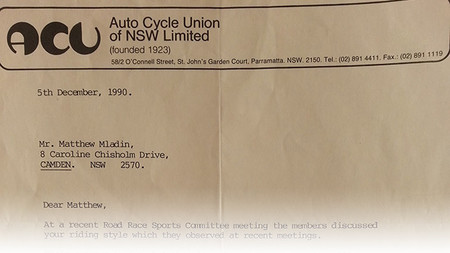 Mat Mladin, siete veces campeón del AMA, se encontraba aún en su Australia natal intentando hacerse paso hasta un campeonato nacional en el que destacaba un tal Aaron Slight (y más tarde, Troy Bayliss). Dos años después de esta carta, en 1992, Mat se coronaba campeón en su primer año como piloto profesional. Y a juzgar por lo visto, no había cambiado ni un ápice su estilo y Mladin, un tipo que declaraba no disfrutar del circo de la prensa (¿no suena un poco Stoner?), se mofaba hace unos días acusándoles, en resumen, de ser unos lloricas.