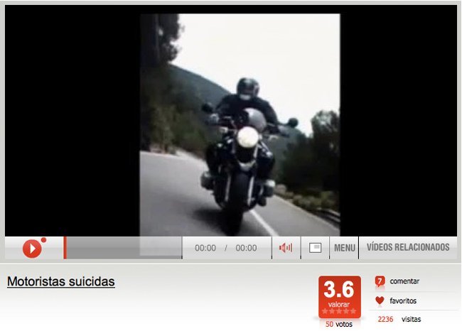 Es decir, buscar en Youtube vídeos de motos, en este caso, del puerto de Montanejos. “Motoristas suicidas” titulan sin remordimiento y haciendo alarde de uno de los mayores problemas del periodismo, el sensacionalismo. Y ahí tenemos las imágenes que acompañan a la noticia. Pero, para sorpresa de todos, lo más grave que vemos en el vídeo es a un conductor con su BMW que pisa durante un segundo la línea continua.