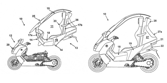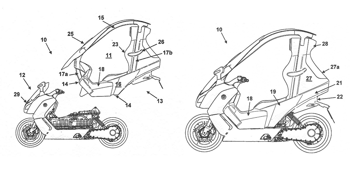 Los dibujos muestran cómo un techo se podría añadir a un scooter y así cambiar su diseño, aumentar su seguridad y mejorar la protección contra el mal tiempo. Al parecer, por lo que cuenta el medio citado, esta idea no solo valdría para el C-Evolution sino también para otros modelos de combustión de la marca. Recordamos que actualmente BMW vende el C 650 GT, el C 650 Sport, el C 400 GT, el C 400 X y el mencionado scooter eléctrico.