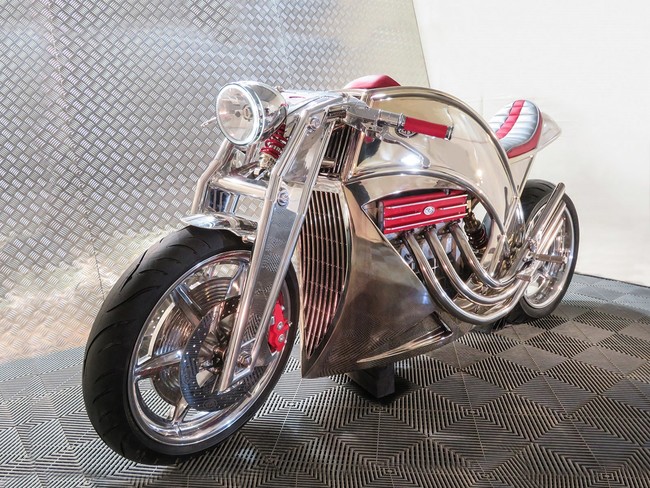 Su carrocería es un voluminoso chasis con un depósito enorme de formas cortadas a machete, los escapes saliendo como un órgano por los laterales y todo repleto de cromados. Las suspensiones son no-convencionales con una delantera de paralelogramo deformable y una trasera con basculante monobrazo y amortiguador oculto.