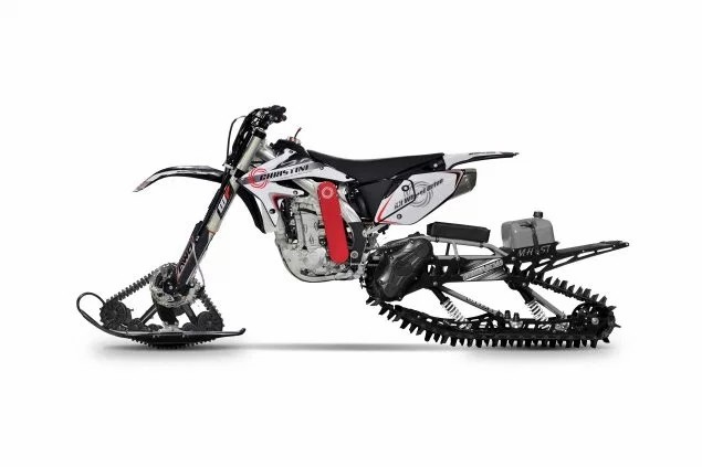La adaptación de motos de cross o enduro a motos de nieve es una cosa rara y espectacular que ya hemos visto en varias ocasiones. Pero lo que no habíamos visto hasta ahora es qué pasaría si juntásemos dos proyectos tan locos como la adaptación a moto de nieve y un sistema de tracción doble.