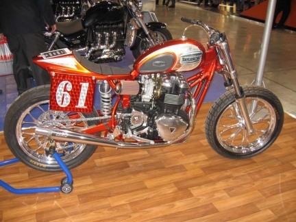 En el stand de Triumph del Salón de Milán de este año estaba expuesta esta joya realizada al parecer partiendo de una Bonneville y con intención de correr Dirt Track con ella. La moto no lleva freno delantero y las palancas del cambio y del freno parecen ambas montadas al lado derecho, transformación especial para Dirt Track oficial o no, sigue siendo una Triumph, y es preciosa. Disfrutad de las fotos y de los detalles, muchos y muy bonitos.